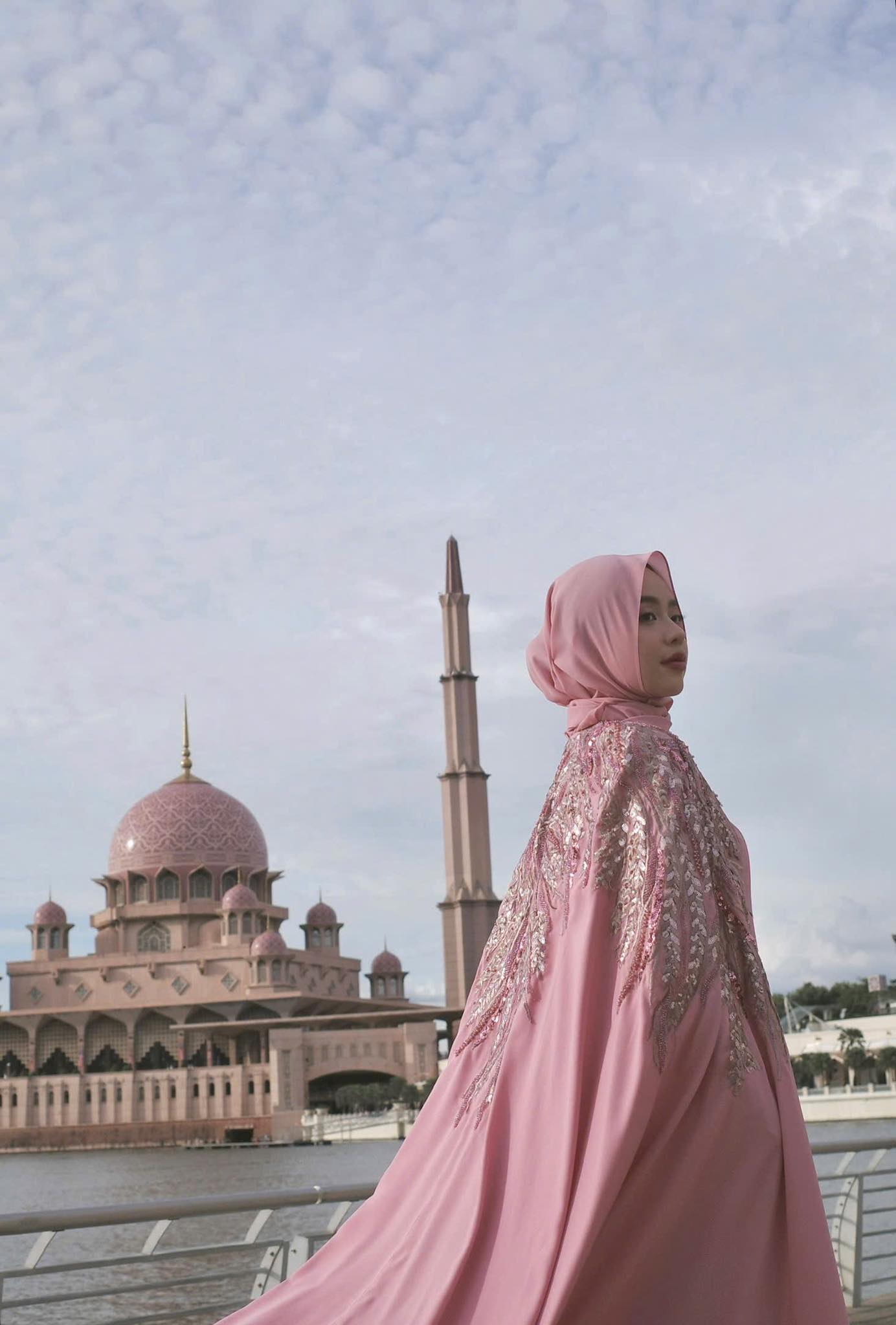 Trong thiết kế Abaya màu hồng pastel kết hợp cùng chi tiết thêu ánh kim, Thanh Thủy toát lên nét dịu dàng nhưng không kém phần sang trọng. Sự lựa chọn khéo léo giữa gam màu nhẹ nhàng và những đường thêu tỉ mỉ giúp tôn vinh vẻ đẹp nữ tính, tinh tế của cô. Đây cũng là lần hiếm hoi người đẹp xuất hiện với phong cách truyền thống Trung Đông, mang lại hình ảnh mới mẻ trong mắt người hâm mộ.
